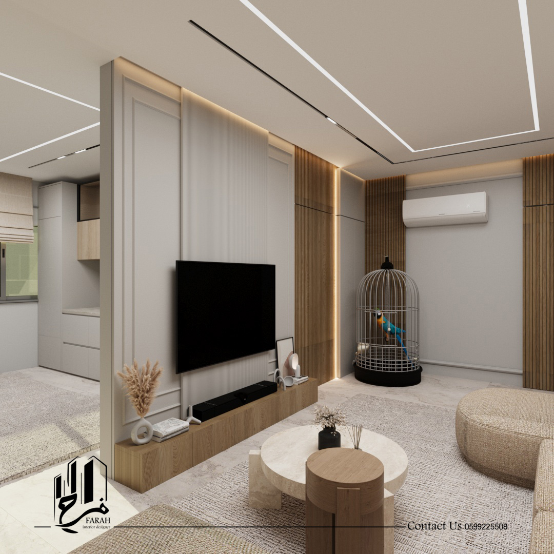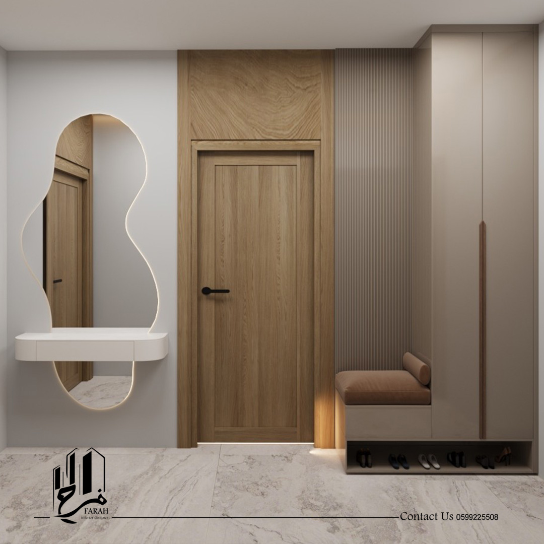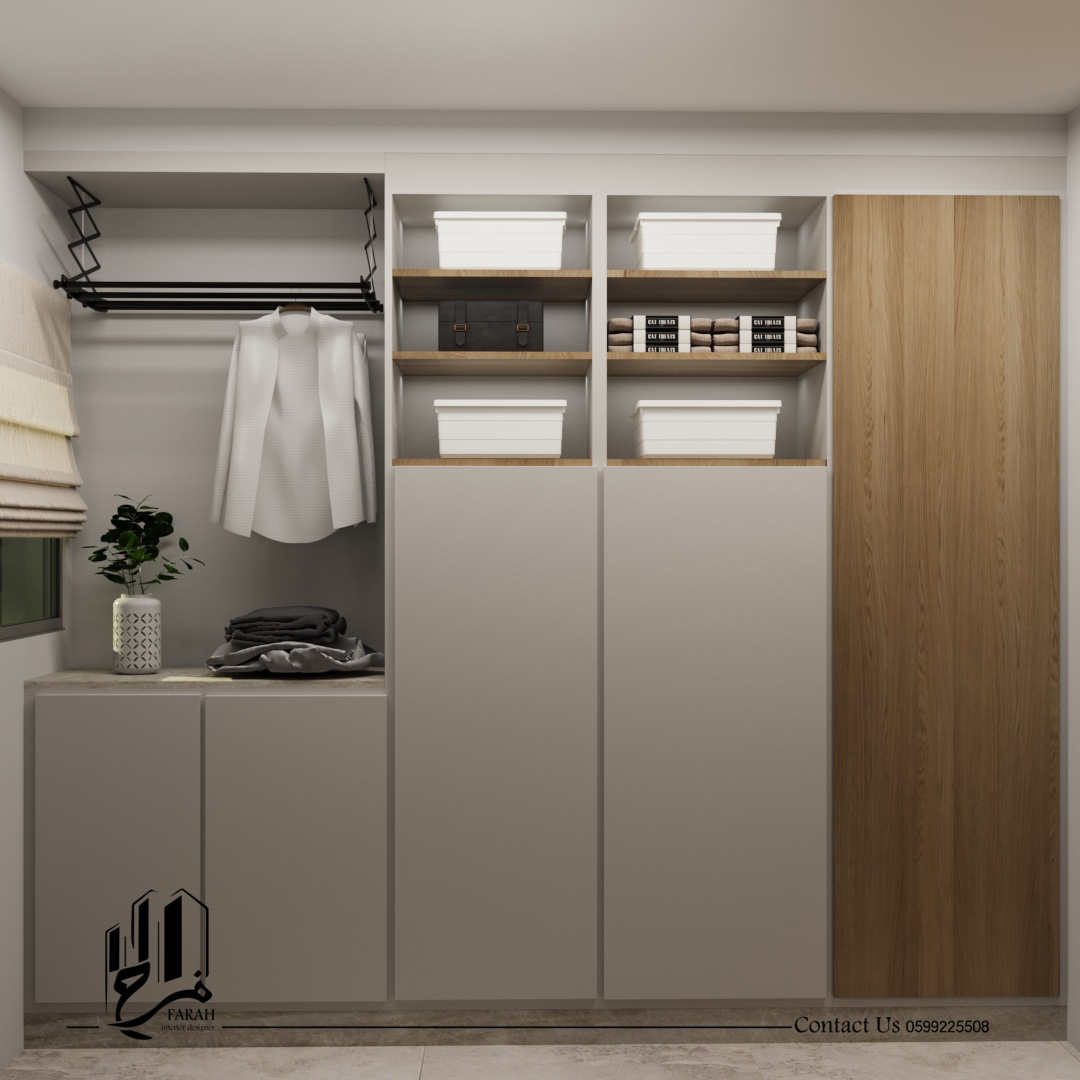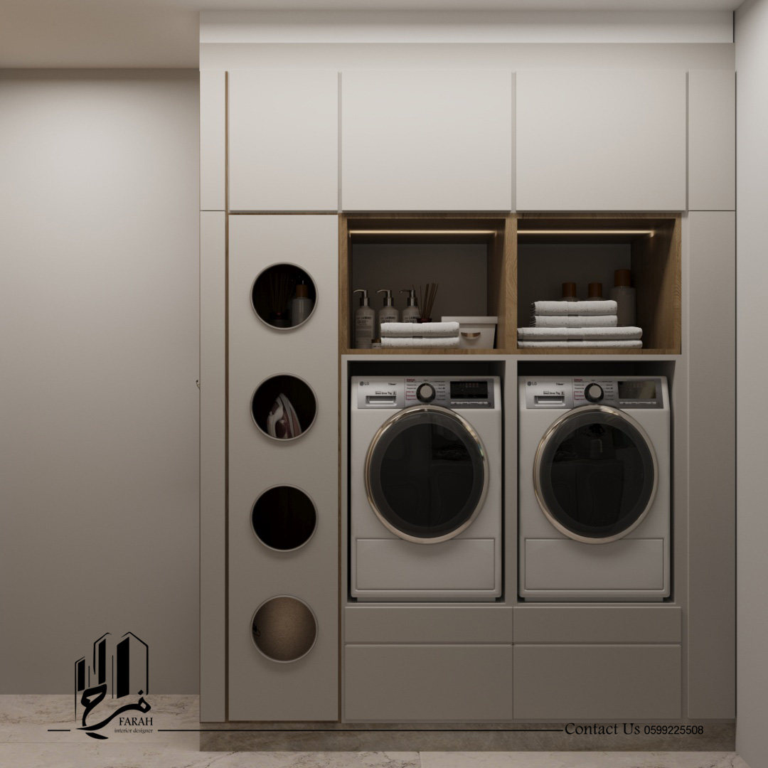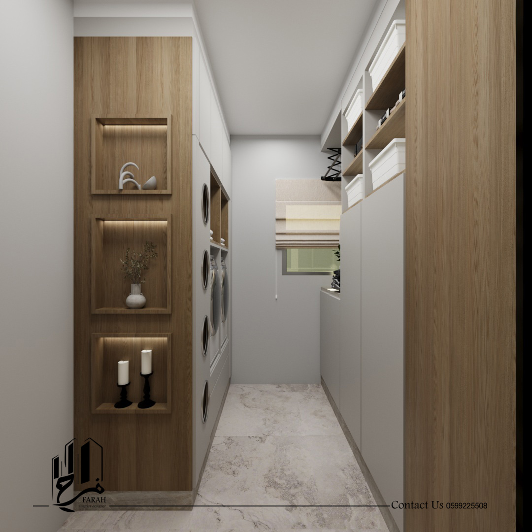 This was addressed by adopting a unified design language based on light wood, calm tones, and clean lines with modern lighting touches that enhance depth and warmth. Vertical details, simple furniture, and integrated elements helped organize the entrance and living area in an elegant way, while the laundry room was designed with practical solutions that maintain order and visually align with the rest of the project.