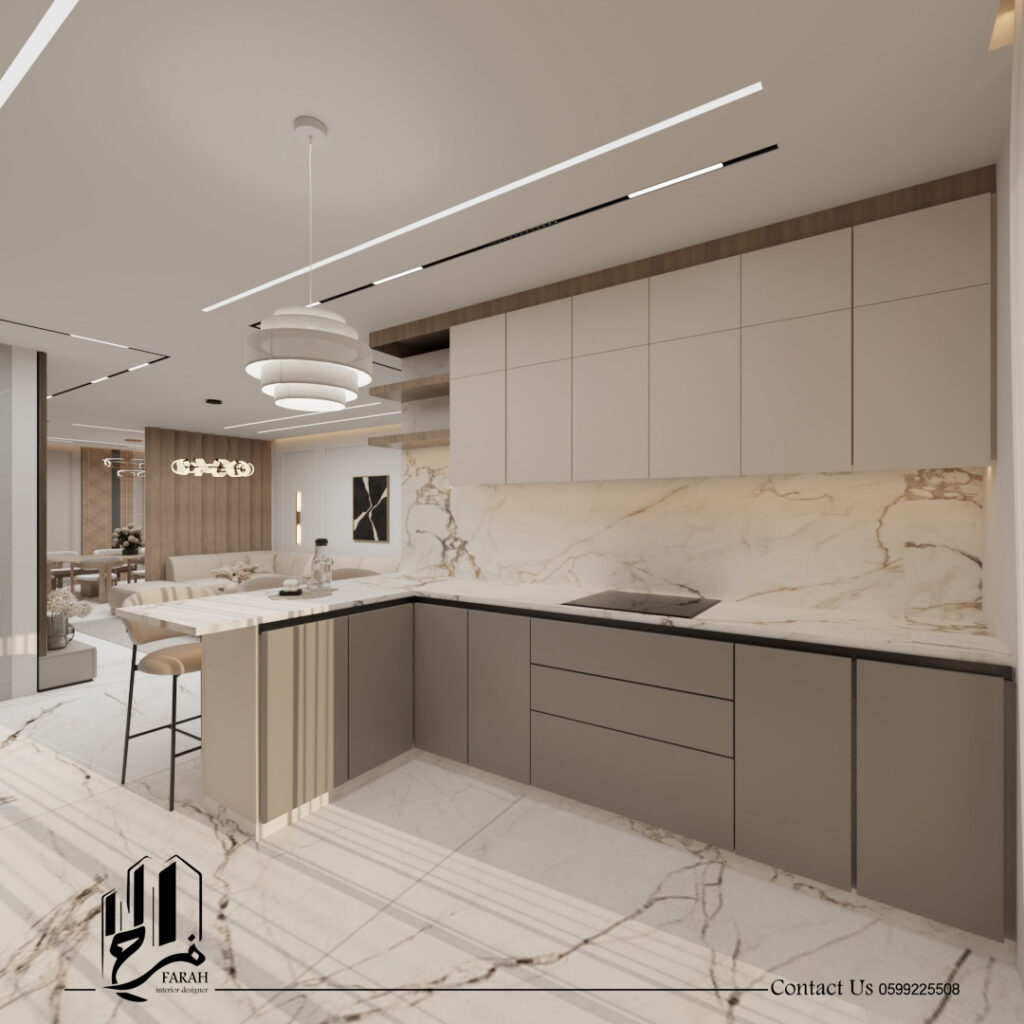 تصميم مطبخ عصري بخطوط بسيطة وألوان هادئة مع تخصيص مكان لكوفي كورنر عملي يضيف لمسة أنيقة ويعزز تجربة الاستخدام اليومية