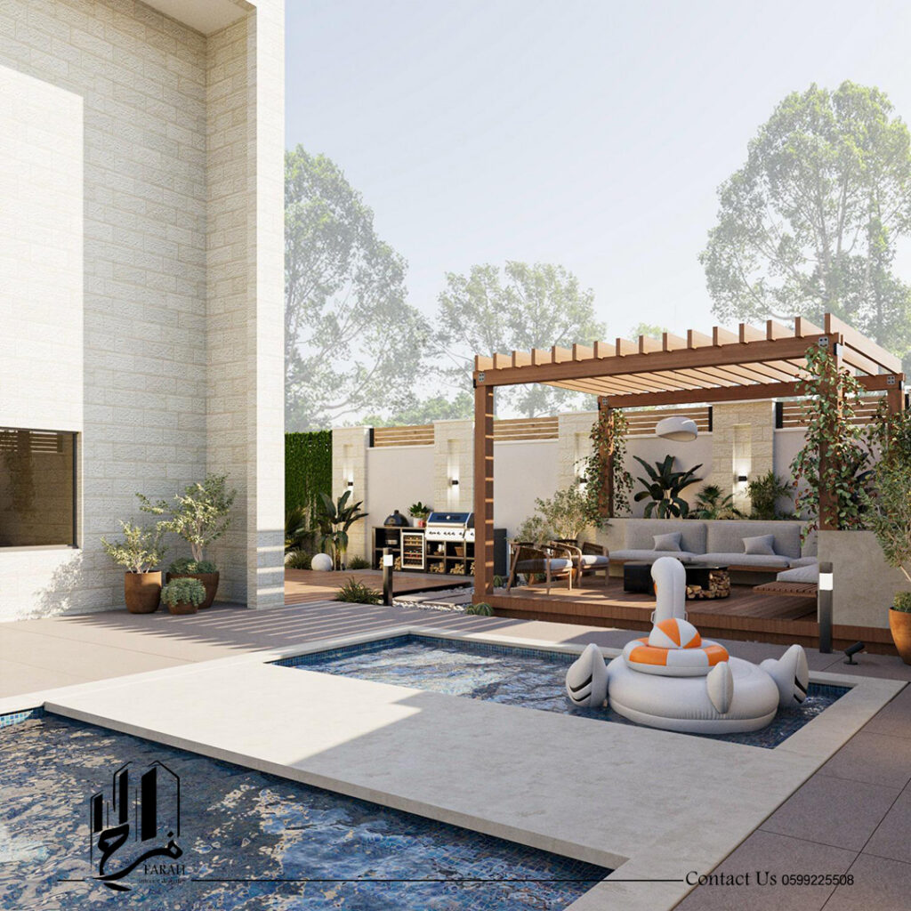 تصميم حديقة خارجية متكاملة لفيلا سكنية، تجمع بين مدخل أنيق، مسار سيارات، جلسات خارجية مريحة، ومنطقة شواء بجانب حوض السباحة ضمن أجواء هادئة وعصرية